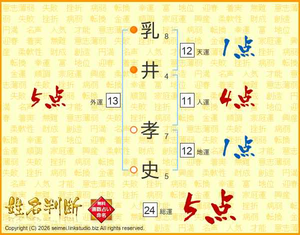 乳井孝史さんの総運は24画の5点!