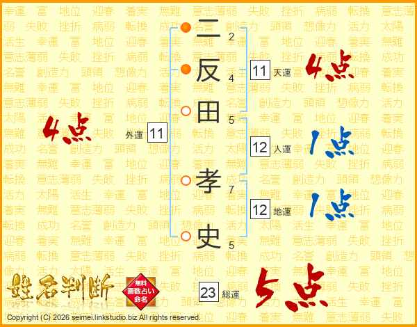 生活面を象徴する運勢です。外部から受ける影響力を表し、結婚運、家庭運や職場、環境への順応性を表します。総運から人運を引いた画数。姓や名が1文字の場合を除く。