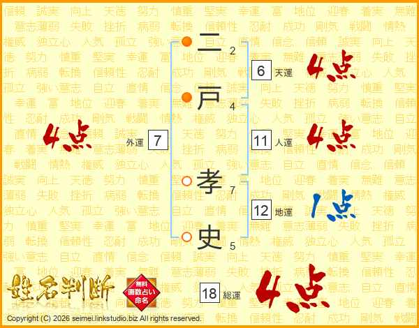 あなたの人生を表す1番重要な運勢です。生涯を通じて影響する総合運となり、主に50歳以降の晩年期に影響を及ぼします。苗字と名前の合計画数。
