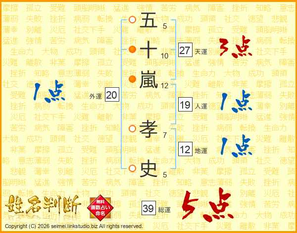 五(5画)十(10画)嵐(12画) 孝(7画)史(5画)