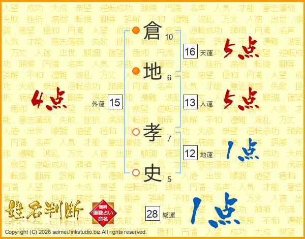 倉(10画)地(6画) 孝(7画)史(5画)