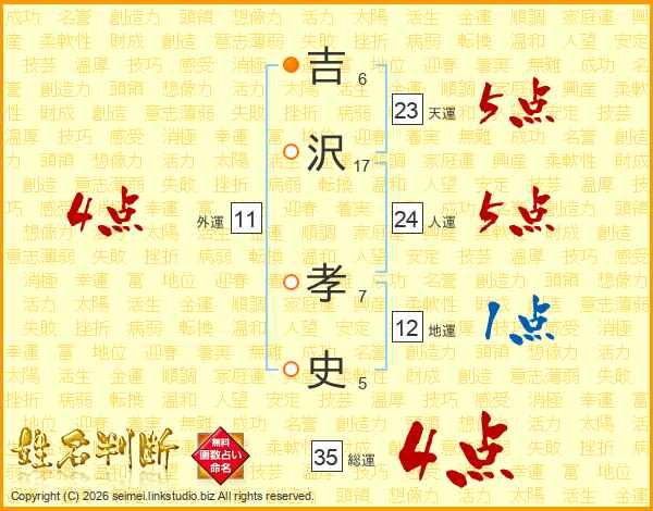 吉(6画)沢(17画) 孝(7画)史(5画)