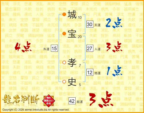 生活面を象徴する運勢です。外部から受ける影響力を表し、結婚運、家庭運や職場、環境への順応性を表します。総運から人運を引いた画数。姓や名が1文字の場合を除く。