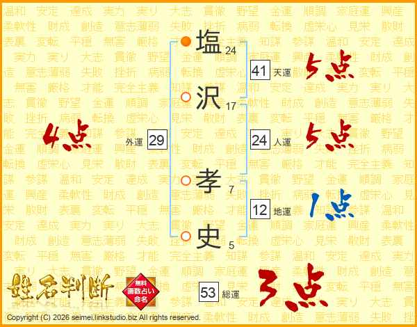 塩(24画)沢(17画) 孝(7画)史(5画)
