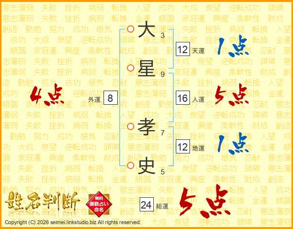 あなたの人生を表す1番重要な運勢です。生涯を通じて影響する総合運となり、主に50歳以降の晩年期に影響を及ぼします。苗字と名前の合計画数。