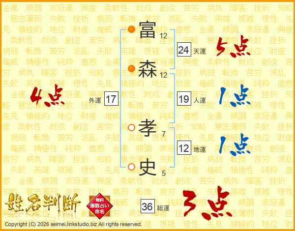 あなたの人生を表す1番重要な運勢です。生涯を通じて影響する総合運となり、主に50歳以降の晩年期に影響を及ぼします。苗字と名前の合計画数。