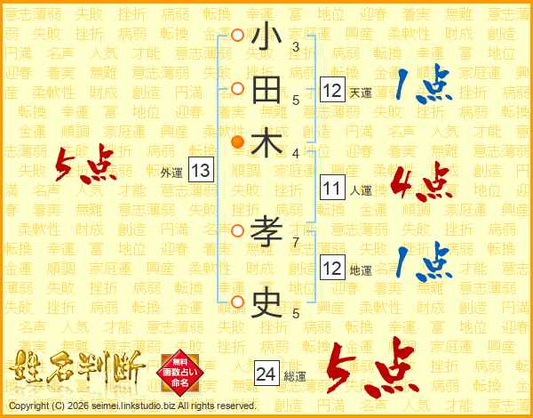 小(3画)田(5画)木(4画) 孝(7画)史(5画)