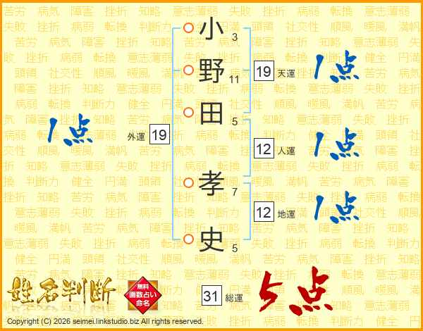 小野田孝史さんの総運は31画の5点!
