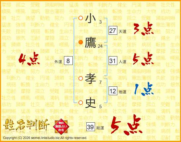 小(3画)鷹(24画) 孝(7画)史(5画)