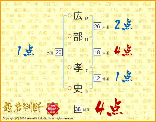 あなたの人生を表す1番重要な運勢です。生涯を通じて影響する総合運となり、主に50歳以降の晩年期に影響を及ぼします。苗字と名前の合計画数。