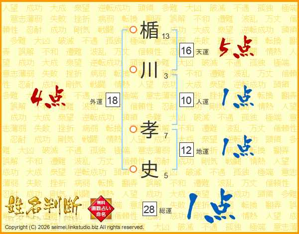 あなたの人生を表す1番重要な運勢です。生涯を通じて影響する総合運となり、主に50歳以降の晩年期に影響を及ぼします。苗字と名前の合計画数。