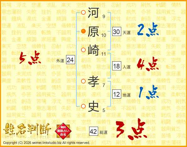 河(9画)原(10画)崎(11画) 孝(7画)史(5画)