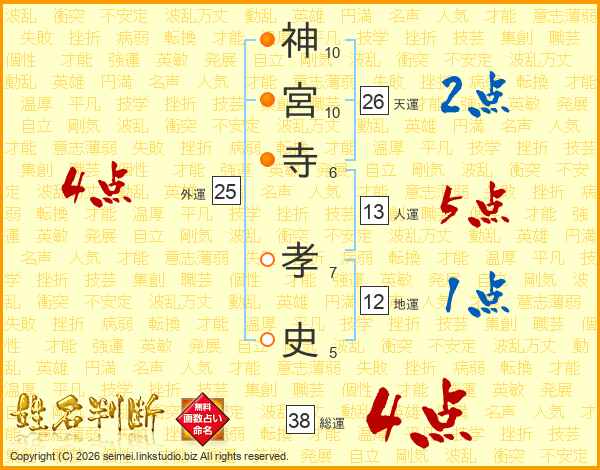 神(10画)宮(10画)寺(6画) 孝(7画)史(5画)