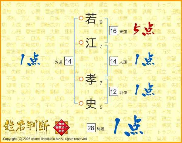 あなたの人生を表す1番重要な運勢です。生涯を通じて影響する総合運となり、主に50歳以降の晩年期に影響を及ぼします。苗字と名前の合計画数。