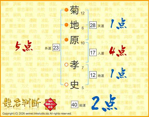 菊(12画)地(6画)原(10画) 孝(7画)史(5画)