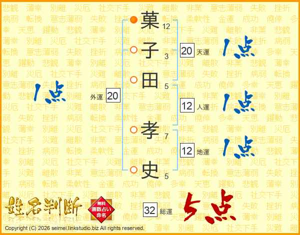 菓(12画)子(3画)田(5画) 孝(7画)史(5画)