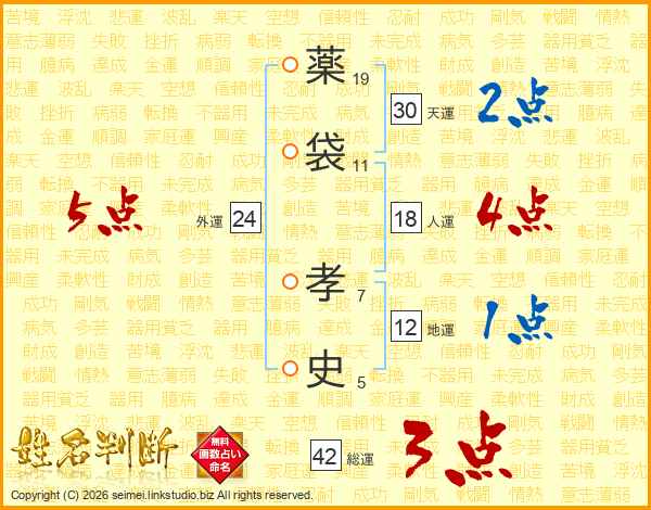 薬(19画)袋(11画) 孝(7画)史(5画)