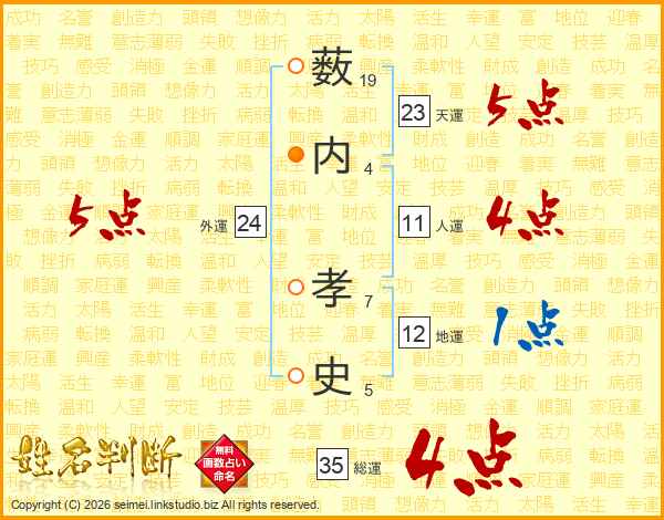 生活面を象徴する運勢です。外部から受ける影響力を表し、結婚運、家庭運や職場、環境への順応性を表します。総運から人運を引いた画数。姓や名が1文字の場合を除く。