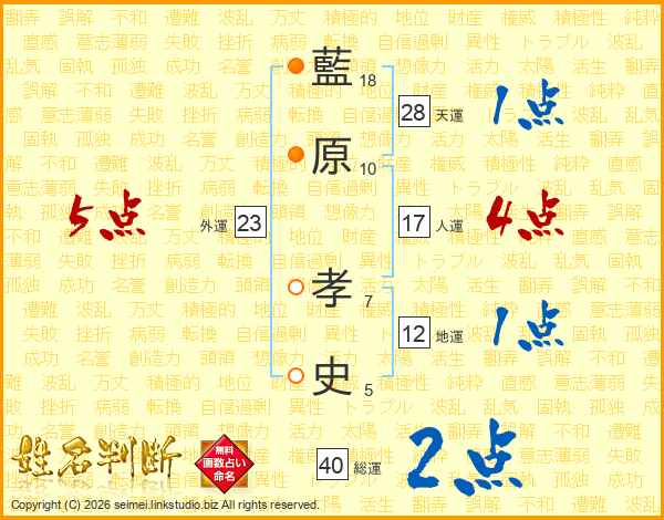 あなたの人生を表す1番重要な運勢です。生涯を通じて影響する総合運となり、主に50歳以降の晩年期に影響を及ぼします。苗字と名前の合計画数。