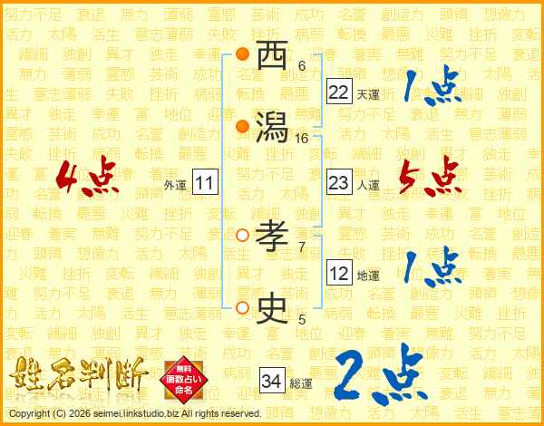 画数の奇数(○陽)と偶数(●陰)の配列で吉凶を占います。どちらかにかたよる名前は大凶名で避ける必要があります。画数の奇数偶数。