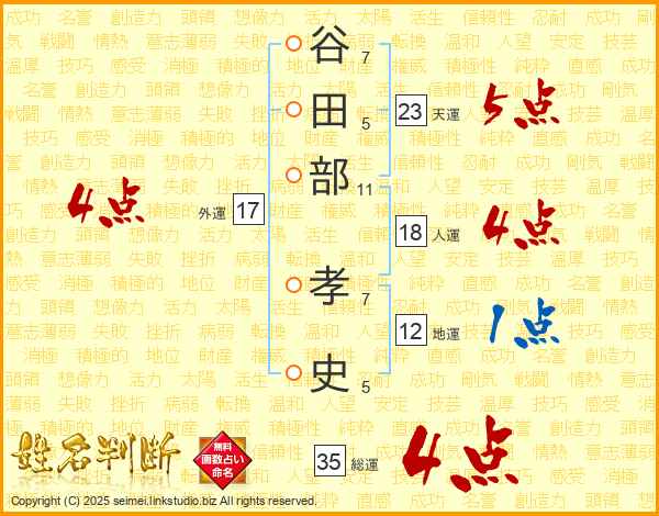 谷(7画)田(5画)部(11画) 孝(7画)史(5画)