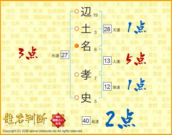 辺(19画)土(3画)名(6画) 孝(7画)史(5画)
