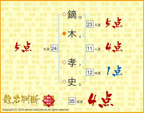 鏑(19画)木(4画) 孝(7画)史(5画)