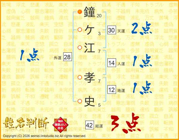 鐘(20画)ケ(3画)江(7画) 孝(7画)史(5画)