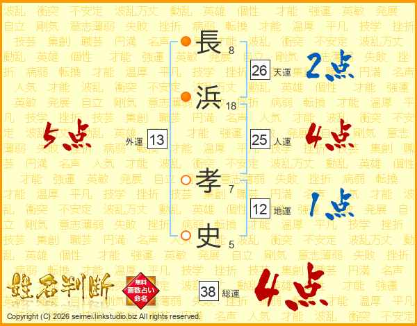 あなたの人生を表す1番重要な運勢です。生涯を通じて影響する総合運となり、主に50歳以降の晩年期に影響を及ぼします。苗字と名前の合計画数。