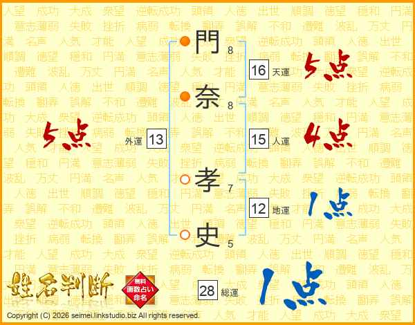 あなたの人生を表す1番重要な運勢です。生涯を通じて影響する総合運となり、主に50歳以降の晩年期に影響を及ぼします。苗字と名前の合計画数。
