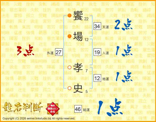 画数の奇数(○陽)と偶数(●陰)の配列で吉凶を占います。どちらかにかたよる名前は大凶名で避ける必要があります。画数の奇数偶数。