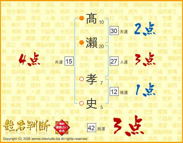 髙(10画)瀨(20画) 孝(7画)史(5画)
