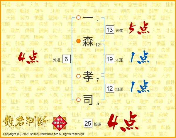 生活面を象徴する運勢です。外部から受ける影響力を表し、結婚運、家庭運や職場、環境への順応性を表します。総運から人運を引いた画数。姓や名が1文字の場合を除く。