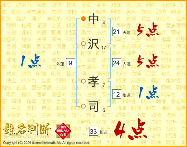 中(4画)沢(17画) 孝(7画)司(5画)