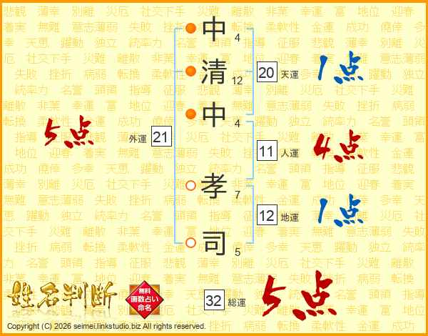 中清中孝司さんの総運は32画の5点!