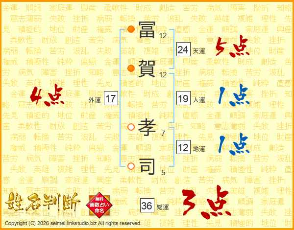 冨(12画)賀(12画) 孝(7画)司(5画)