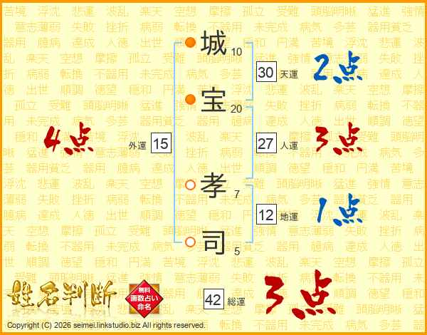 あなたの人生を表す1番重要な運勢です。生涯を通じて影響する総合運となり、主に50歳以降の晩年期に影響を及ぼします。苗字と名前の合計画数。