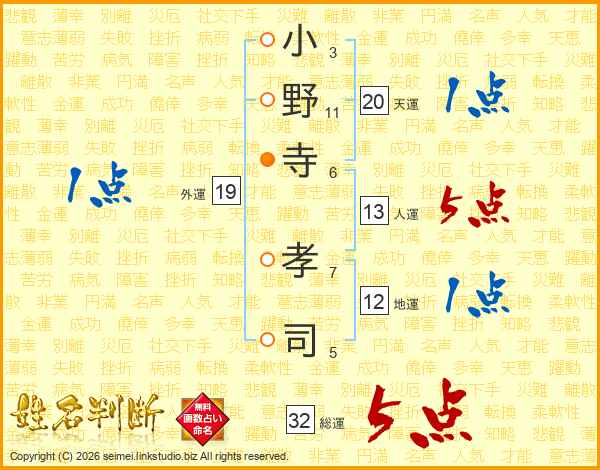 小野寺孝司さんの総運は32画の5点!