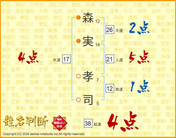 あなたの人生を表す1番重要な運勢です。生涯を通じて影響する総合運となり、主に50歳以降の晩年期に影響を及ぼします。苗字と名前の合計画数。