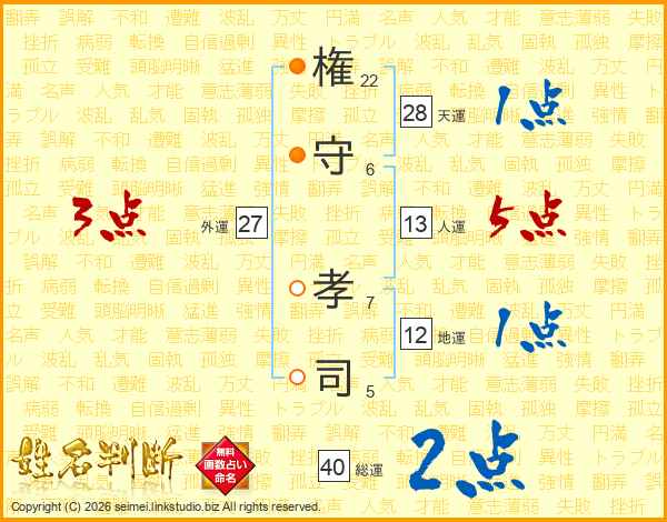 権(22画)守(6画) 孝(7画)司(5画)