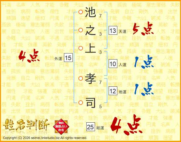 池(7画)之(3画)上(3画) 孝(7画)司(5画)
