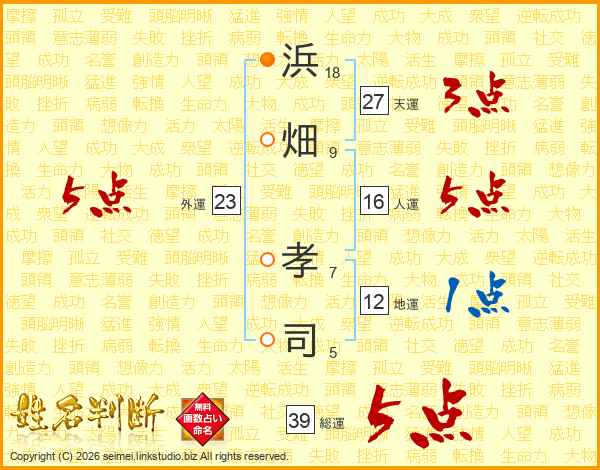 浜(18画)畑(9画) 孝(7画)司(5画)