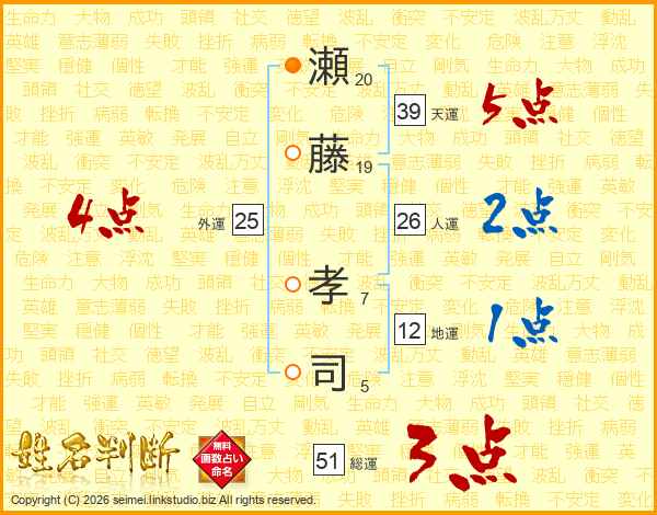 瀬(20画)藤(19画) 孝(7画)司(5画)