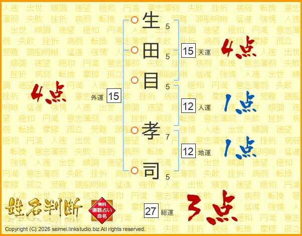 生(5画)田(5画)目(5画) 孝(7画)司(5画)