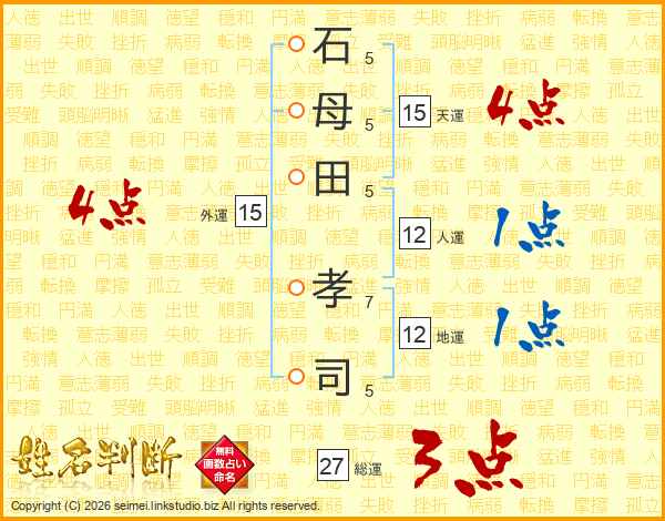 石(5画)母(5画)田(5画) 孝(7画)司(5画)