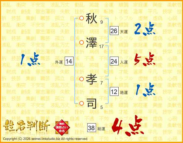 秋(9画)澤(17画) 孝(7画)司(5画)