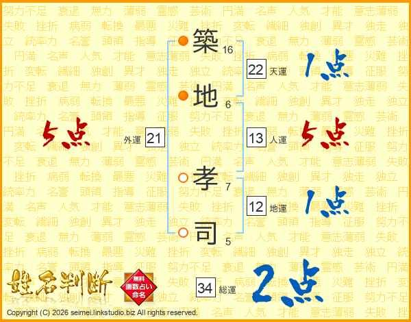 築(16画)地(6画) 孝(7画)司(5画)