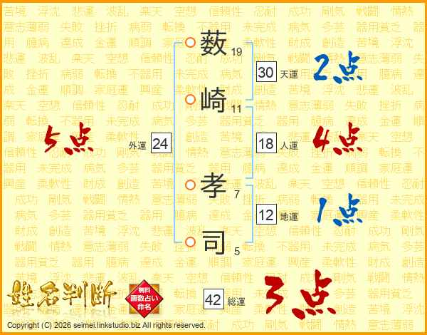 薮(19画)崎(11画) 孝(7画)司(5画)