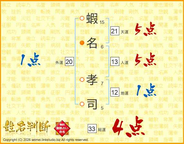 蝦(15画)名(6画) 孝(7画)司(5画)
