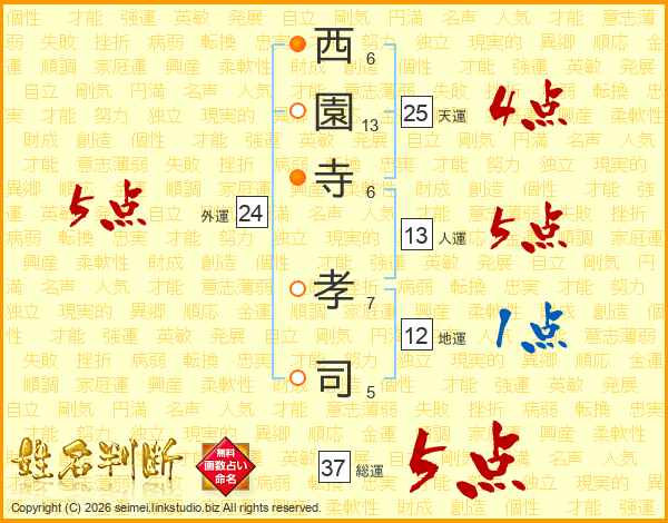 西(6画)園(13画)寺(6画) 孝(7画)司(5画)
